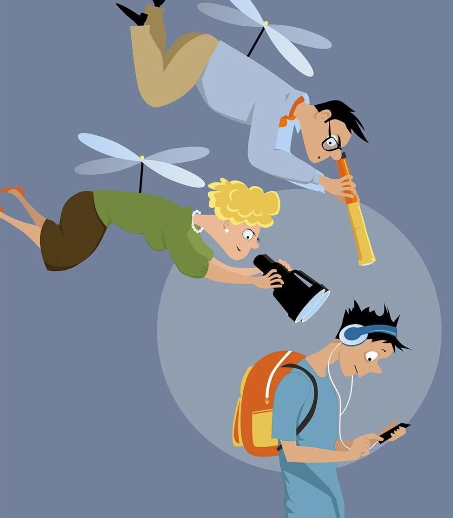 Clinicians and social critics call these mothers “helicopter parents”, who hover around their teens and young adults, trying to monitor and protect their children from making mistakes or getting into trouble. They say that these overly involved, protective parents are hurting their young adults, not letting them think and act for themselves, and maybe making them anxious. There are many books on this topic like Julie Lythcott-Haims’ How to Raise an Adult (2015).